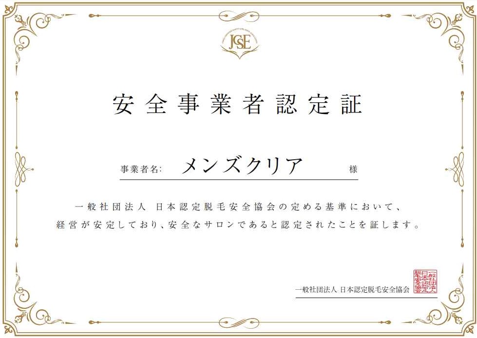 メンズクリアは、2024年に一般社団法人日本認定脱毛安全協会が定める厳しい基準を満たし、「安全事業者認定」を取得している脱毛サロンです。
