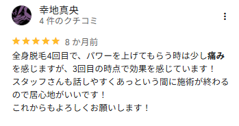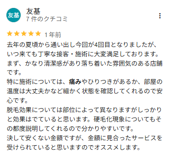- 「腕や脚はほぼ無痛。回数を重ねるほど痛みが減った。」