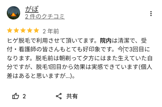 効果もかなり感じている 看護師さんも優しい 毛質も薄くなって生えにくくなっている 毛が減り毛穴感も無くなったという 他院と比較して値段で決めた 5回目くらいから圧倒的に薄くなった | 対応に不安点が多い 清潔さに難あり スタッフの対応が高圧的で印象が悪かった |